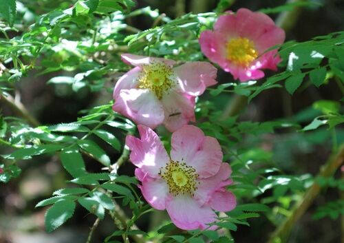 とある場所で、ベニバナヤマシャクヤクの開花を確認しに行った帰り道。 サンショウバラもきっとどこかには咲いているのでは、との確信に近い思いで、林道沿いをゆっくり探しながら走行 梅雨の中休みの貴重な晴れ間。 渓流沿いの林緑に映えるピンク色を発見。…